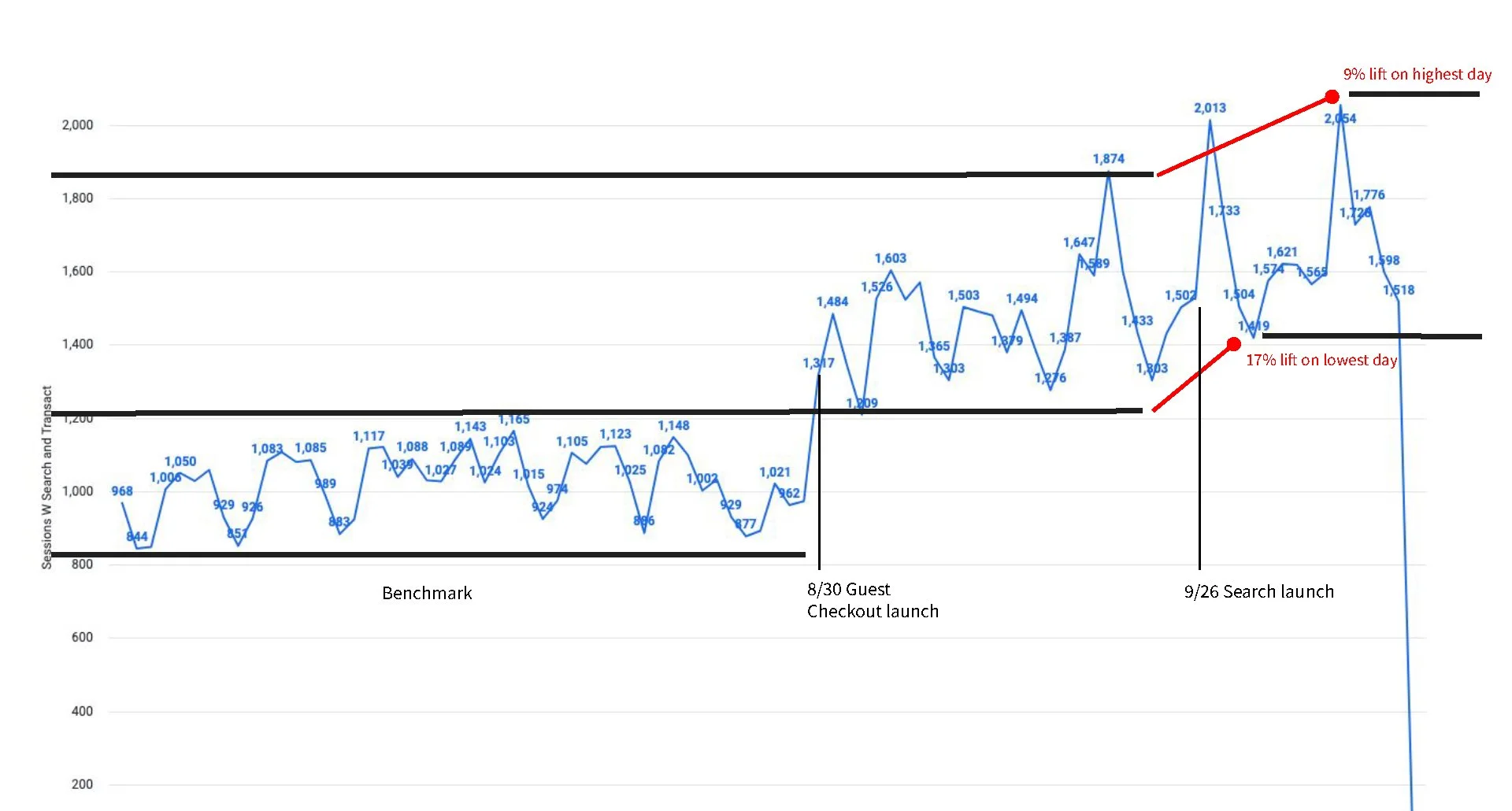 Daily uplift ranged between +9% and +17%, depending on user flow and device type.